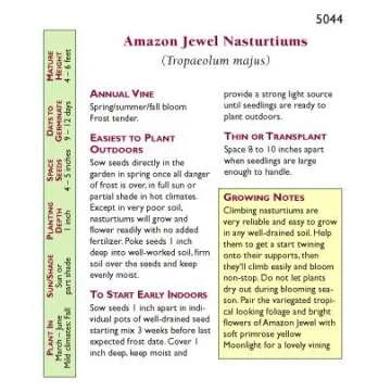 Show moreDiscover the enchanting beauty of the Nasturtium - Climbing Amazon Jewel Seeds, where vibrant colors meet lush, unusual foliage. This delightful plant features variegated vining leaves that will add a touch of tropical wonder to your garden. As these seeds germinate, expect to be captivated by their brilliant spurred blossoms in a stunning array of exotic shades, including Pumpkin, Peachy-Rose, Ruby, Gold, and Pale Lemon. Perfect for creating a breathtaking display, these flowers promise to transform your outdoor space into a veritable jungle of gemstones, bursting with fragrance and color that will delight the senses.