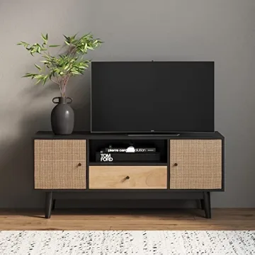 Show more Introducing the Nathan James 74201 Bonnie Modern TV Stand, a beautiful blend of functionality and aesthetic appeal that caters to your media needs while enhancing the charm of your living space. This elegantly crafted media console features a stunning natural wood finish and distinctive rattan cane cabinet doors, offering a warm and bohemian vibe that perfectly complements any decor style. Its spacious design includes an open cubby, a roomy drawer, and additional cabinet space, ensuring you have ample room to store your entertainment essentials while keeping your space free from clutter.