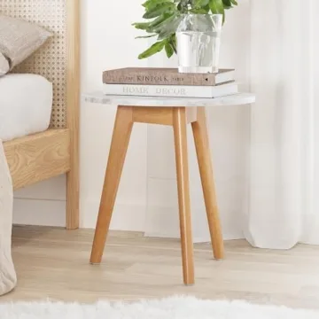 Show moreIntroducing the Nathan James Amalia Accent Table, an exquisite blend of style and functionality that enhances any living space. This stunning mid-century modern end table features a beautiful white marble-laminate top with an exceptional scratch and stain-resistant finish, making it as practical as it is elegant. Crafted from textured solid wood, its sturdy frame can comfortably support up to 75 lbs, making it an ideal companion for your lamp, drinks, or decor. The glossy finish not only adds a touch of sophistication but also resembles high-end materials without the accompanying price tag.