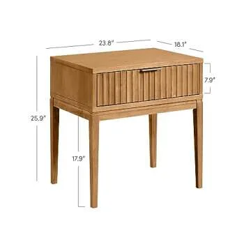 Show moreIntroduce a touch of classic elegance to your home with the Nathan James Jasper Mid-Century Accent Side Table. This stylish and functional piece is not just a table; it’s a statement! Crafted with a wood frame in a stunning natural brown finish, this nightstand is perfect for elevating your living space. With its mid-century modern design, tapered legs, and unique fluted drawer front, it effortlessly combines aesthetic appeal with practicality, making it an ideal option for any room, whether as a bedside table or an accent piece in your living area.