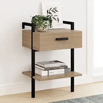 Show more The Nathan James Jenny 2-Tier Wall Mount Rustic Nightstand is the perfect blend of industrial chic and rustic charm, designed to elevate your bedtime sanctuary. Crafted from high-quality light oak wood and paired with a sleek matte black metal frame, this nightstand is not just a functional piece of furniture, it's a statement of style and convenience. Its innovative space-saving design features not just a spacious drawer for stowing away nighttime essentials, but also a spacious open shelf that provides the perfect platform for decorative items or your favorite books. Imagine how effortlessly it will enhance your bedroom's aesthetic while offering practical functionality as well.