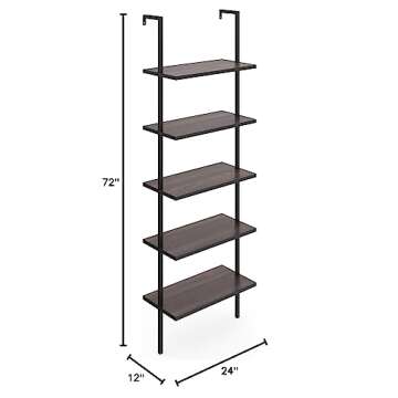 Show more The Theo Industrial Ladder Shelf redefines home organization with its unmatched blend of durability and style. Crafted with a robust metal frame that perfectly complements its oak-laminate reclaimed wood shelves, this 5-tier bookcase offers a stunning vintage aesthetic that seamlessly fits into any home decor. Perfectly suited for your home office, living room, or any space needing a touch of modern elegance, this shelf is a statement piece that is as functional as it is attractive. Stable bookshelves that can hold up to 50 lbs. per shelf ensure you can display everything from your extensive book collection to cherished decorative items without worry.
