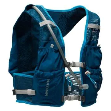 Show more The VaporAir Vest & Hydration Pack by Nathan is your ultimate companion for any adventure on the trails. This innovative hydration vest combines functionality with comfort, ensuring you stay hydrated while you conquer your miles. Equipped with a 2L hydration bladder, this vest ensures you have ample water supply without the weight of bulky bottles. With two easily accessible front bottle pockets that can each fit up to 22oz flasks, you can carry an incredible amount of hydration seamlessly.
