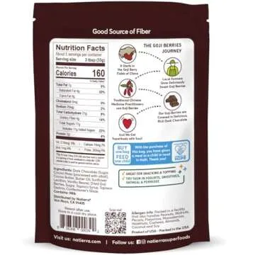 Show moreIndulge in the delicious taste of NATIERRA Dark Chocolate Covered Goji Berries, a perfect blend of health and satisfaction wrapped in rich dark chocolate. This 6-ounce pack offers a delightful snacking experience that not only pleases your palate but also nourishes your body. NATIERRA is committed to sustainability and nutrition, enriching lives while providing nutrient-packed superfoods. Each bag purchased contributes to a noble cause, providing one meal to a child in need in Haiti, emphasizing that snacking can come with a conscience.