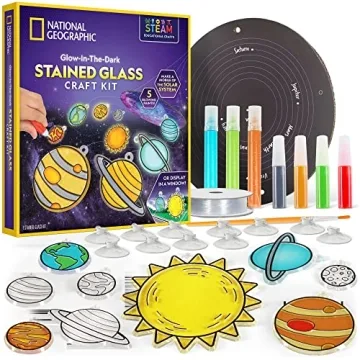 Show more Discover the wonders of the universe with the NATIONAL GEOGRAPHIC Kids Window Art Kit, an enchanting Solar System Arts and Crafts Kit that brilliantly blends creativity and education. Designed thoughtfully for young explorers, this all-inclusive kit provides everything needed to craft a stunning 3-dimensional solar system model. Featuring vibrant acrylic suns and planets, as well as specially formulated glow-in-the-dark and metallic paints, children can unleash their artistic flair while learning about the cosmos. Whether as delightful window art or captivating hanging mobiles, this craft set guarantees hours of imaginative fun and educational engagement!