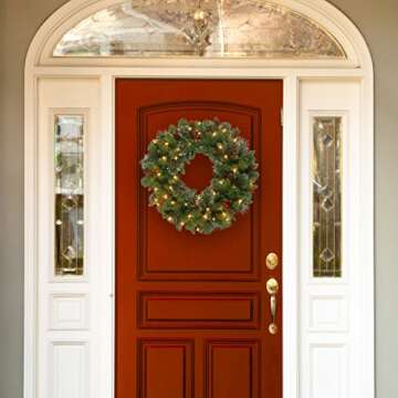 National Tree Company Pre-Lit Artificial Christmas Wreath, Green, Carolina Pine, White Lights, Decorated with Pine Cones and Glitter, Berry Clusters, Christmas Collection, 30 Inches