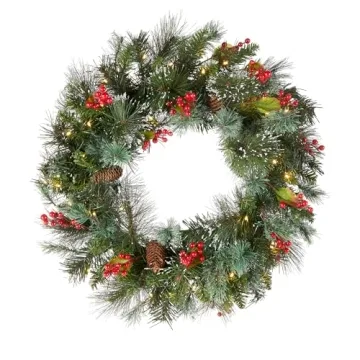 Show more Welcome the festive season into your home with the extraordinary National Tree Company Pre-Lit Artificial Christmas Wreath, a stunning 24-inch wreath that beautifully enhances your holiday decor. Crafted with an attention to detail that speaks volumes, this vibrant wreath features a lush Wintry Pine branch base adorned with an elegant array of pine cones, berry clusters, and frosted branches. It's more than just a decoration; it's a captivating statement piece that invites the warm spirit of the holidays into your space.