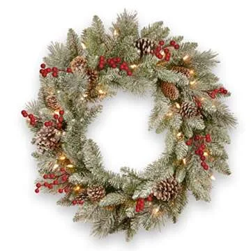 Show more Transform your holiday decor with the exquisite 24-inch Pre-Lit Artificial Christmas Wreath by National Tree Company. This stunning wreath is designed with a Snowy Bristle Spruce branch base, giving it a lush, full-bodied appearance that beautifully captures the essence of Christmas. Adorned with charming pine cones and vibrant berry clusters, it effortlessly enhances any space, making it a delightful addition to your indoor or outdoor decorations.