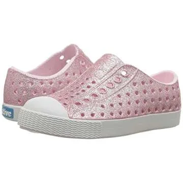 Show moreIntroducing the Native Shoes Jefferson Bling Child, a perfect blend of fun, function, and style for your little ones! Designed with play in mind, these ultralight sneakers are super lightweight and incredibly comfortable, making them ideal for active toddlers. The slip-on style not only offers ease of wear but also showcases an innovative EVA upper that features all-over perforations. This clever design ensures that your child's feet stay cool and breathable during all their adventures, be it playtime in the park or a casual day out. The stunning Milk Pink Bling/Shell White colorway adds a playful touch, ensuring your child looks adorable while staying comfortable.