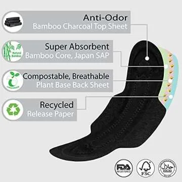 The innovative use of bamboo charcoal not only ensures that these pantyliners are odor-free but also enhances absorbency, providing you with the ultimate protection. Each liner is individually wrapped, making them convenient for on-the-go use. Plus, with certifications such as GOTS, HALAL, and compostable, you can take pride in choosing a product that’s good for your body and the planet.
