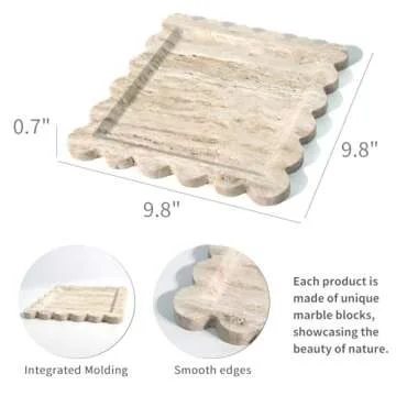 Show moreElevate your home decor with this exquisite Natural 100% Marble Vanity Tray, designed to add a touch of luxury to any space. Carefully crafted from high-quality natural marble, each tray showcases its own unique marble pattern, ensuring that your new decor piece is truly one-of-a-kind. The captivating beige travertine finish, paired with elegant scalloped edges, makes this tray more than just functional; it is a striking centerpiece in its own right.