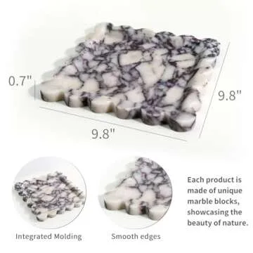 Show moreIntroducing the Natural 100% Marble Vanity Tray, an exquisite addition to your home decor that combines functionality with unparalleled luxury. Crafted from 100% high-quality natural marble, this tray features a unique Calacatta Viola pattern, making each piece a one-of-a-kind masterpiece. Unlike ordinary plastic or resin options, this tray is exquisitely sturdy and showcases a stunning shine and texture that elevates any space. Perfectly sized at 9.8 x 9.8 inches, it embodies elegance, versatility, and durability.