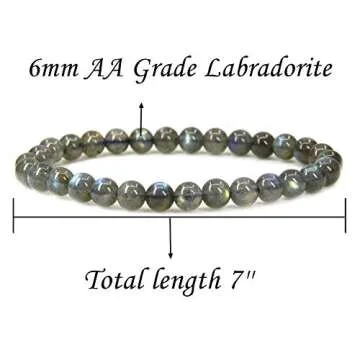 Discover the enchanting beauty of the Natural A Grade Labradorite Gemstone Bracelet, a unique piece that showcases the mesmerizing qualities of genuine labradorite stones. Each bracelet is handmade and features round beads measuring 6mm, designed to fit comfortably on wrists ranging from 6.5 inches to 7 inches. This artistic piece arrives in an elegant 'Angelstones' pouch, enhancing its appeal as a thoughtful gift.