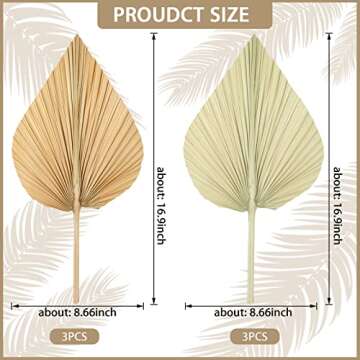 Show more Transform your living space with the enchanting allure of our natural dried palm leaves! Handcrafted from the finest tropical plants, this exquisite package includes 6 unique pieces, each showcasing its own character and charm. Air-dried and hand-pruned with meticulous care, every palm leaf varies slightly in shape, size, and color, ensuring that your decorations are as unique as you are.
