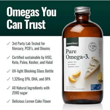 Show moreIntroducing the Natural Force Pure Omega-3 - the ultimate solution for those seeking the myriad benefits of omega-3 fatty acids without the discomfort associated with traditional fish oil capsules. With just one teaspoon delivering an impressive 1,326mg of pure, concentrated EPA, DHA, and DPA omega-3s in a highly bioavailable natural triglyceride form, this liquid fish oil is designed for optimal absorption. What sets our product apart is not just its potency but also its delightful lemon cake flavor, making it not only easy to take but also enjoyable. Sourced from a Marine Stewardship Council certified sustainable fishery, you can feel good about your purchase knowing it's environmentally friendly and supports sustainable practices.