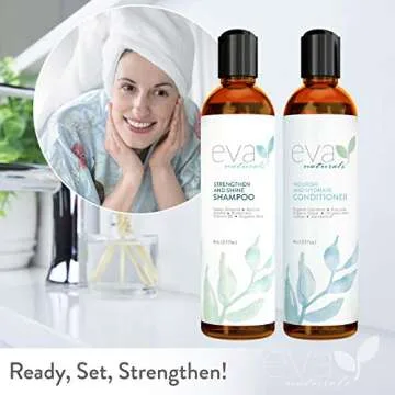 Show more Transform your hair care routine with the revolutionary Hair Growth Shampoo and Conditioner Set by Eva Naturals. This dynamic duo is designed to fortify weak and brittle hair, ensuring you achieve the luscious locks you've always desired. The shampoo gently cleanses, while the conditioner deeply nourishes, allowing your hair to flourish. Fortifying silk amino acids work tirelessly to mend your strands, putting an end to breakage and allowing for stronger hair growth.