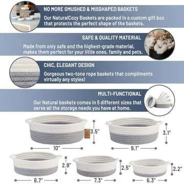 NaturalCozy 5-Piece Round Small Woven Baskets Set– Cotton Rope Baskets for Organizing! Montessori Toys, Fruits Remotes Key Tray Bowl for Entryway Desk, Shallow Catchall Home Décor, Cat Dog Bin Gift
