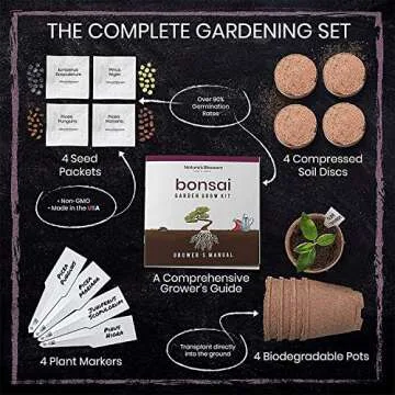 Show moreDiscover the joy of gardening with the Nature's Blossom Bonsai Tree Kit, your ultimate starter kit for growing four exquisite bonsai tree varieties right at home! This all-inclusive bonsai kit features seeds from the enchanting Jacaranda Mimosifolia, the resilient Pinus Aristata, the striking Pinus Thunbergii, and the charming Picea Mariana. With each seed pack, you are equipped to cultivate beautiful miniature trees that enhance any indoor or outdoor environment and infuse your living space with fresh air and tranquility.