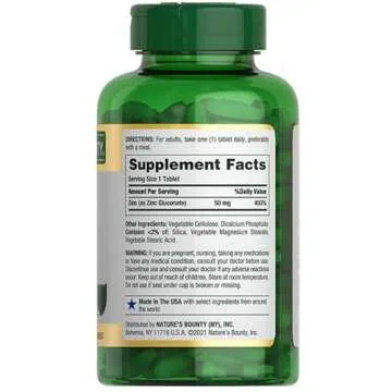 Show moreExperience the powerful benefits of nature with Nature's Bounty Zinc 50 mg. Each bottle contains a generous supply of 400 caplets, delivering a high potency dose of 50 mg of zinc per serving. Dubbed a vital mineral, zinc plays a crucial role in supporting immune health, skincare, and overall well-being.