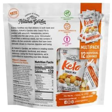 Show moreIntroducing the Nature's Garden Keto Snack Mix, an irresistible blend of flavor and nourishment that perfectly complements your ketogenic lifestyle. Each convenient 1 oz bag is packed with a delightful medley of Probiotic Cheese Balls, crunchy nuts, and a variety of delectable ingredients designed to satisfy your cravings without compromising your diet. Imagine indulging in creamy cheddar cheese puffs, combined with a crunchy assortment of almonds, pepitas, pecans, and macadamia nuts—all while keeping your carb intake low. Make snack time an enjoyable part of your day with a mix that’s not only tasty but also supports your health goals.