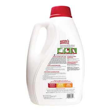 Show moreDiscover the transformative power of the Nature’s Miracle Stain and Odor Remover, the ultimate cleaning companion designed specifically for pet owners. Renowned in the industry for over 35 years, Nature’s Miracle has built a formidable reputation as a reliable solution for tackling the toughest of stains and odors. Are you tired of stubborn pet accidents on your carpets, floors, and furniture? Look no further! This remarkable formula effectively combats the mess left by cat urine, feces, vomit, and drool, restoring your home to its pristine condition.