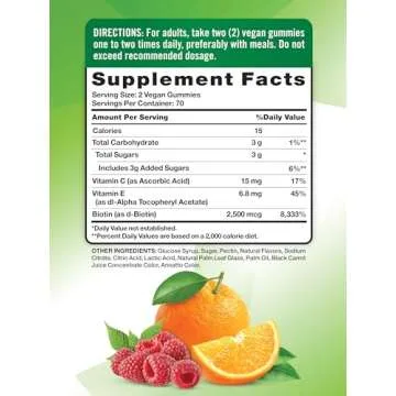 Show moreDiscover the secret to radiant beauty from within with Nature's Truth Hair, Skin & Nails Gummies. Each gummy is a delicious fusion of powerful ingredients meticulously crafted to enhance your beauty routine. Packed with an impressive 2500mcg of Biotin and enriched with essential Vitamins C & E, these vegan-friendly gummies are designed to promote luscious hair, glowing skin, and strong nails. Whether you’re on a quest for stronger hair, smoother skin, or healthier nails, our beauty complex delivers the nutrients your body craves while indulging your taste buds with fruity flavors.
