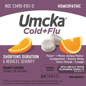 Nature's Way Cold+Flu Relief Chewables, Umcka, Shortens Duration & Reduces Severity, Multi-Symptom Relief, Homeopathic, Non-Drowsy, Orange Flavored, 20 Chewable Tablets (Packaging May Vary)