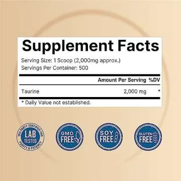 Show moreNatureBell Pure Taurine Powder is your go-to solution for high-quality amino acid supplementation. Packed with 2.2 pounds (1kg) of 100% pure taurine, this unflavored powder is designed for effortless incorporation into your favorite drinks. Each serving provides a potent dose of 2000mg of taurine, and with up to 500 servings per pouch, you have a long-lasting supply perfect for any active lifestyle. This high bioavailable free form taurine is not only essential for supporting exercise performance and energy production but is also crucial for heart health, making it a must-have for fitness enthusiasts and health-conscious individuals alike.