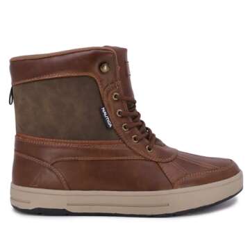 Show moreIntroducing the NAUTICA Men's Lockview Insulated Weather-Resistant Snow Boot, the ultimate solution for navigating cold and wet conditions without sacrificing style. This exceptional boot combines a chic Vegan Leather Upper with a durable Duck Boot Bottom, ensuring weather resistance and longevity. Designed with a shaft measuring approximately 7 inches from the arch, this boot offers the perfect height for added protection against snow and slush while maintaining a sleek appearance.