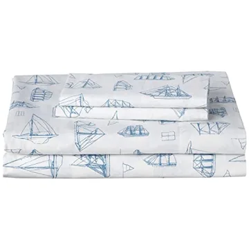 Show more Transform your bedroom into a serene retreat with the Nautica Queen Sheet Set, a splendid combination of elegance and comfort. Crafted from 100% high-quality cotton, these sheets boast a delightful percale weave that provides a crisp and cool feel against your skin, ensuring a refreshing sleep experience each night. Featuring a unique design of sailboats and ships, the Whitewood Sail pattern captures the essence of nautical adventure, adding a charming touch to your bedding ensemble. Enjoy the peace of mind that comes with easy maintenance; these sheets are machine washable and resistant to fading, allowing them to maintain their look and feel wash after wash.