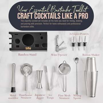 Show more Discover the art of mixology with our Complete 12-Piece Cocktail Mixer Set, a premium bartending kit designed for both novice and experienced cocktail lovers. This exquisite set includes everything you need to craft cocktails like a pro, featuring a stylish Boston shaker, Japanese jigger, muddler, and much more, all elegantly organized in a sustainable bamboo stand.