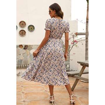 Show moreStep into effortless elegance with the NAVINS Women Floral Print Puff Sleeve Tiered A-Line Swing Midi Dress. Created with the modern woman in mind, this captivating dress features a delicate round neckline and stylish puffy short sleeves adorned with elastic frilly flutter trim. The charming vintage flower pattern adds a nostalgic charm, making it perfect for any occasion, from brunch outings to elegant beachside parties.