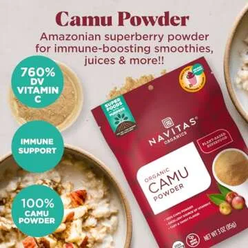 Show more Introducing the Navitas Organics Camu Camu Powder, the ultimate superberry from the Amazon that brings a powerhouse of nutrients straight to your wellness routine. This tart cherry-like superfruit holds the title for having the highest vitamin C content of any food on earth—offering a whopping 10 times more vitamin C than an orange! Each teaspoon provides an astonishing 760% Daily Value (DV), ensuring you're well-equipped to fortify your immune system and support long-term vitality.