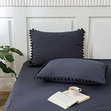Navy Blue Pom Poms Pillowcases, Dark Blue Standard Queen 20x30 Inches Pillowcases Set of 2, 100% Washed Microfiber, Navy Fringe Pillow Shams, 2 Pack (Standard, Navy Blue)