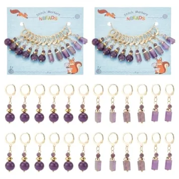 Show more Introducing the exquisite NBEADS 24 Pcs Natural Amethyst Stitch Markers—a perfect blend of functionality and beauty for every knitting enthusiast! Each set comprises 12 round and 12 column Amethyst charm stitch markers, elegantly designed at about 1.5 inches (3.8 cm) in length. The gentle hues of the natural gemstones not only provide a visually stunning accessory for your knitting project but are also believed to offer spiritual peace and calmness during your crafting sessions. Each stitch marker comes beautifully packaged with a separate ring for easy storage, making them an ideal gift for yourself or a fellow crafter.