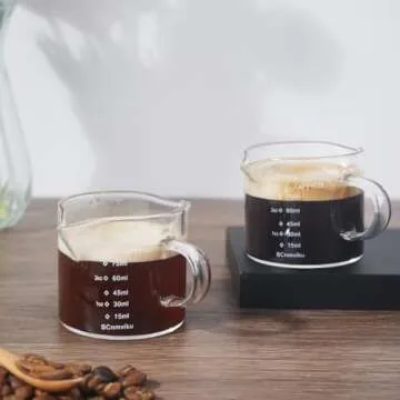 Show moreIntroducing the NCnnwovf 2 Pack Double Spouts Measuring Triple Pitcher Milk Cup with Handle - the ultimate companion for espresso lovers and culinary enthusiasts alike! Crafted from high-quality borosilicate glass, these sleek and elegant 75ml pitchers serve not only functionality but also aesthetics. Designed to withstand extreme temperatures from -20°C to 150°C, you no longer have to worry about thermal shock ruining your precious serving glass. The ergonomic handle ensures a comfortable grip, making pouring smooth and effortless. Each double spout is purposefully crafted to minimize spilling, allowing for precision in each espresso shot or sauce measurement.