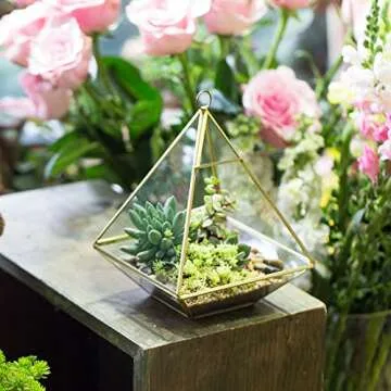 Show more Introducing the exquisite NCYP Small Geometric Glass Open Terrarium, a stunning centerpiece that effortlessly combines functionality with elegance. Crafted with a unique vertebral geometric shape and framed in lustrous brass, this terrarium is not just a decorative piece—it’s a statement of modern style and a perfect home for your favorite plants! Sized at 5.9 x 5.9 x 7.87 inches, it seamlessly fits any setting, whether displayed on a table, hanging from the ceiling, adorning a wall, or resting on a shelf.