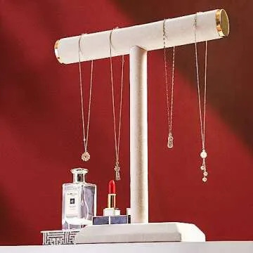 Show more Introducing the Necklace Holder Stand, the ultimate solution for displaying and organizing your cherished jewelry collection! With an elegant design crafted from soft beige velvet and enhanced by a stunning gold metal lid, this organizer not only provides a functional space for your necklaces but also adds a touch of luxury to your home decor. Measuring a generous 15.4 inches tall and featuring a length of 13.8 inches, it effortlessly holds up to 18 necklaces, ensuring they're neatly stored and readily accessible for any occasion.