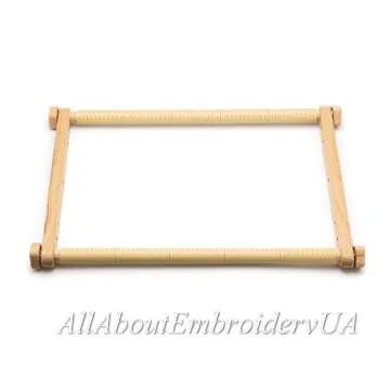 This frame accommodates fabric sizes adjusted by the holes in the vertical bars, allowing for a variety of cross-stitch pieces.