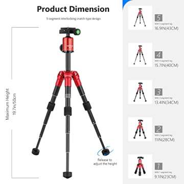 This Mini Tripod stands out for its versatility and convenience. It extends to a height of 19.7 inches (50cm), accommodating a range of shooting needs, and can easily fold down to just 9.1 inches (23cm), fitting snugly into your camera bag. The tripod features five adjustable-height leg tubes, allowing you to set the perfect height whether you're shooting landscapes or close-up macro photography. Additionally, its non-slip feet design ensures a steady shot, even on uneven surfaces, giving you the peace of mind to focus on capturing those perfect moments.