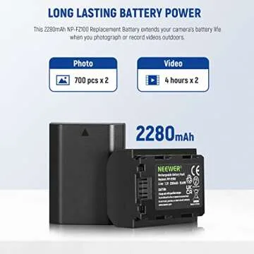 Show more The NEEWER Dual Battery Charger Set is the ultimate companion for photographers, vloggers, and filmmakers looking to elevate their creative pursuits. Offering two powerful 2280mAh NP-FZ100 rechargeable batteries, this set ensures that you will never miss capturing those precious moments that deserve to be shared and cherished. The versatility of the included charging case allows you not only to charge these batteries but also to protect them from any potential damages while maintaining a compact and lightweight convenience for travel. This durability is essential for outdoor creators who need reliable power on-the-go.