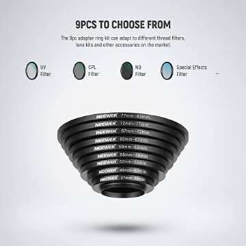 Neewer 9 Pieces Lens Filter Rings Set, Made of Anodized Aluminum, Includes: 37-49mm, 49-52mm, 52-55mm, 55-58mm, 58-62mm, 62-67mm, 67-67mm, 8-2.8 35" 72-77mm 77-82mm