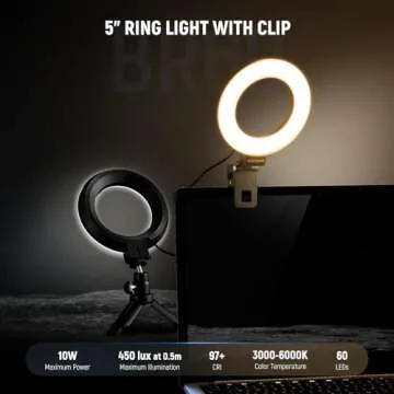 Show more Say goodbye to dull lighting during your video calls and online meetings with the NEEWER Basic 5" Ring Light. This innovative clip-on light kit is meticulously designed for those who require optimal illumination for video conferencing, streaming, and creative endeavors. Featuring 60 high-quality LEDs, it delivers an impressive 450Lx brightness at a distance of just 0.5 meters with a color temperature range of 3000K to 6000K. Its remarkable Color Rendering Index (CRI) of over 97 ensures your skin looks vibrant and natural, making it an essential tool for the remote work environment as well as content creation.