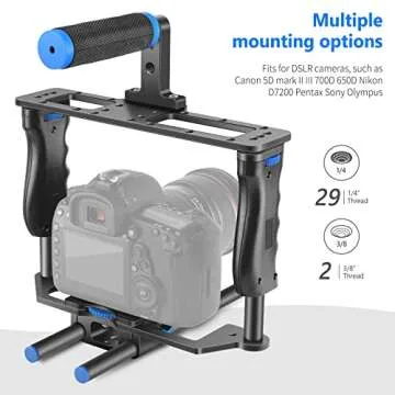 The NEEWER camera cage enhances your shooting stability, thanks to its cleverly designed dual handgrips. You can achieve smooth shots while filming action sequences or tranquil landscapes with remarkable ease. The padded top handle supports low-angle shots, giving you the freedom to explore various filming perspectives creatively. Plus, the adaptive dual-rod base allows for effortless adjustments and adds more mounting options, accommodating everything from follow focuses to lens supports. With the built-in 1/4” thumbscrew, you can swap your camera from setup to filming in an instant.