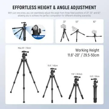 With adjustable height and angle capabilities, you can customize the tripod to your ideal shooting setup. Adjust its height from 11.6" to 20" in seconds, while also being able to select between three fixed angles of 23°, 53°, and 82°. This ensures you capture the perfect composition in any context, be it a close-up or expansive landscape shot.