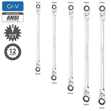 Neiko 03114A Flex-Head Double Box End Ratcheting Wrenches, Chrome Vanadium Steel | Extra Long Design | 5-Piece Set | Metric 8mm - 19mm
