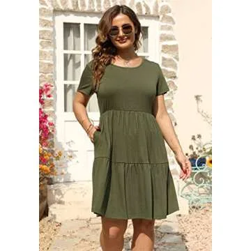 Show more Introducing the stunning Nemidor Women's Plus Size Casual Ruffle Dress, a wardrobe essential designed specifically for the fashion-forward plus-size woman. This elegant short sleeve midi dress combines comfort and style, making it a versatile piece perfect for all occasions. The dreamy layered swing silhouette, made from a soft and breathable jersey cotton blend, ensures you not only look fabulous but feel great too. The dress features a flattering high stretchy waistline and a beautiful 3-tiered and ruffled hem that adds a touch of vintage charm to your outfit. Available in a rich Army Green, this dress lets you express your individuality while enjoying its plush, wrinkle-resistant fabric. Whether you're headed to a casual outing, a sophisticated dinner, or a relaxed weekend gathering, this dress seamlessly transitions to any setting, inviting compliments wherever you go!