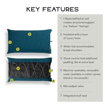 The Fillo Luxury Pillow boasts a 3-inch I-beam baffled air cell that eliminates that uncomfortable "balloon feeling," creating a natural pillow shape that conforms to your resting position. It’s designed with a thick luxury foam that provides a soft, yielding feel, unlike traditional inflatable camp pillows. With its wider dimensions, this pillow accommodates broad-shouldered users, making it a truly versatile option for all types of sleepers.