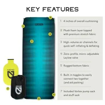 Show moreDiscover the ultimate comfort in outdoor sleeping with the NEMO Equipment Roamer Sleeping Pad - XL Wide - Lagoon. This innovative sleeping pad features a cutting-edge Flow Core construction that incorporates high-volume air channels for incredible self-inflation and quick deflation, making your setup easier than ever. Experience the perfect balance between durability and comfort with the premium stretch fabric top that cradles your body while providing a remarkably resilient base with its robust 75D bottom fabric. Plus, the materials used are bluesign certified and composed of 100% post-consumer recycled resources, making it an eco-friendly choice for the conscious adventurer. Lightweight and compact compared to rival products, the Roamer XL ensures that you won't have to compromise on thickness or comfort, no matter where your travels take you.