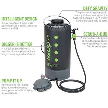 Show moreExperience a revolution in outdoor bathing with the NEMO Helio LX Pressure Shower. Designed for outdoor enthusiasts, this portable shower provides a convenient solution for staying fresh during camping trips, hiking expeditions, or beach outings. With its multifunctional design and robust features, it ensures that you can enjoy a refreshing shower wherever you are. The Helio LX holds up to 11 liters of water, providing a dependable source for a long, powerful shower whenever you need it. Lightweight and compact, it easily fits into your backpack or vehicle, making it an essential companion for all your adventures.